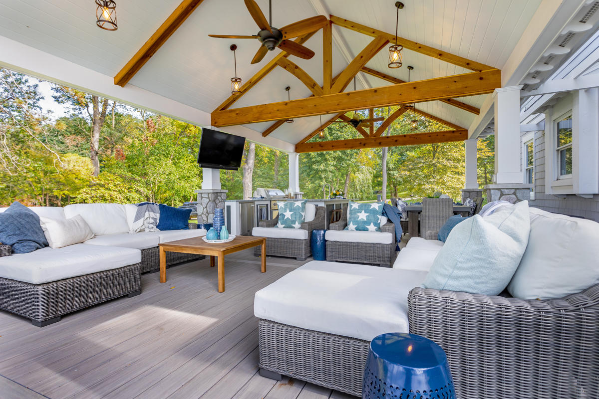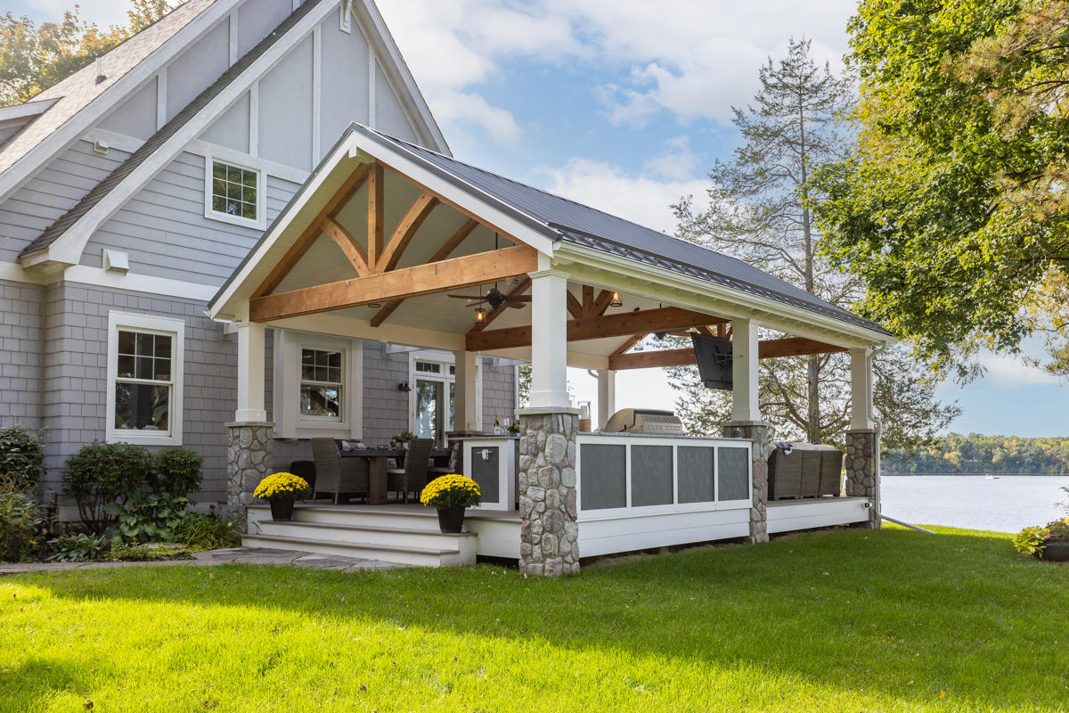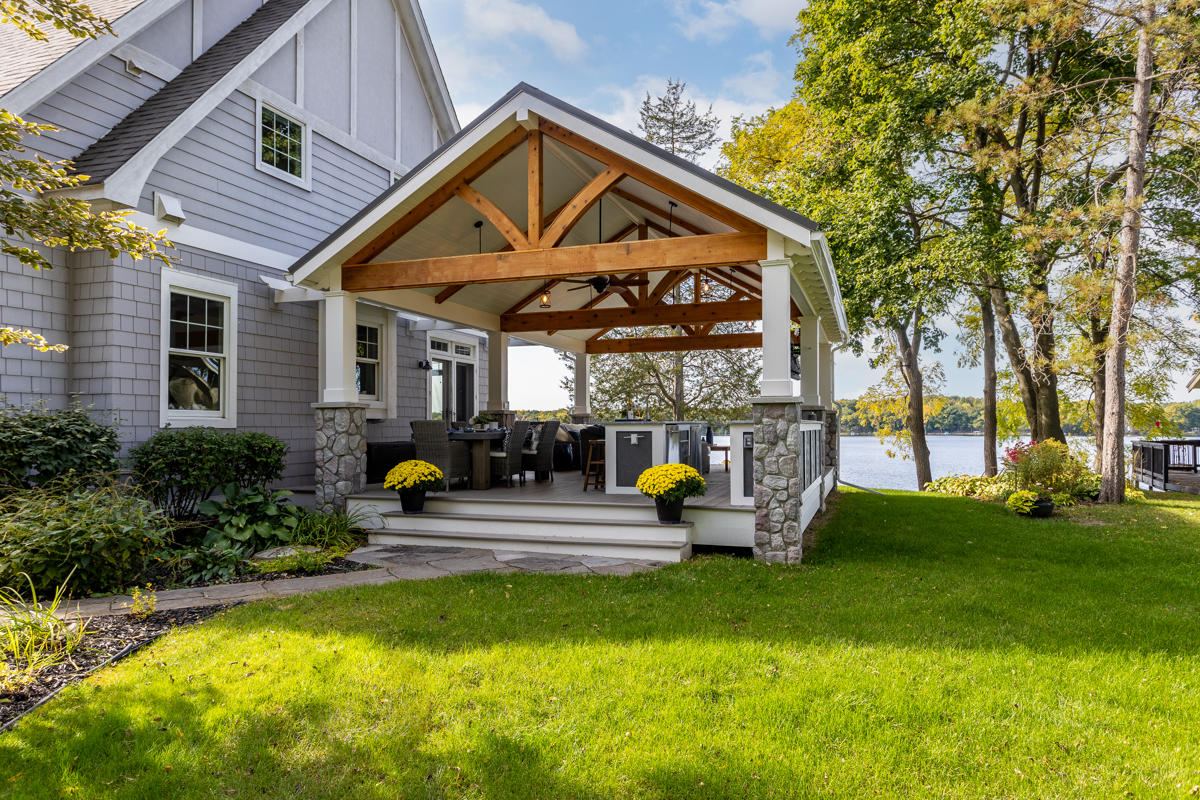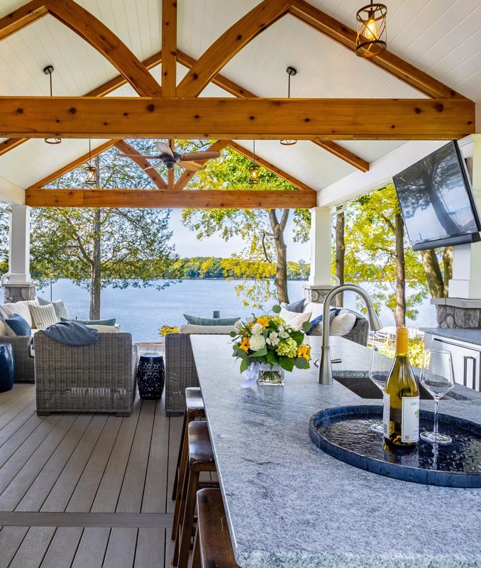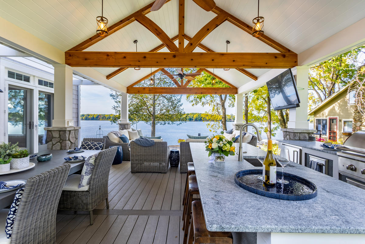 Our clients, returning to us with a new vision, sought to elevate their home’s connection to the outdoors. They wished for a multifunctional space that marries comfort, recreation, and the beauty of lakeside living. We answered with a custom-designed covered kitchen and lounge area, a seamless extension of their home that supports everything from lively celebrations to peaceful mornings with coffee by the water.