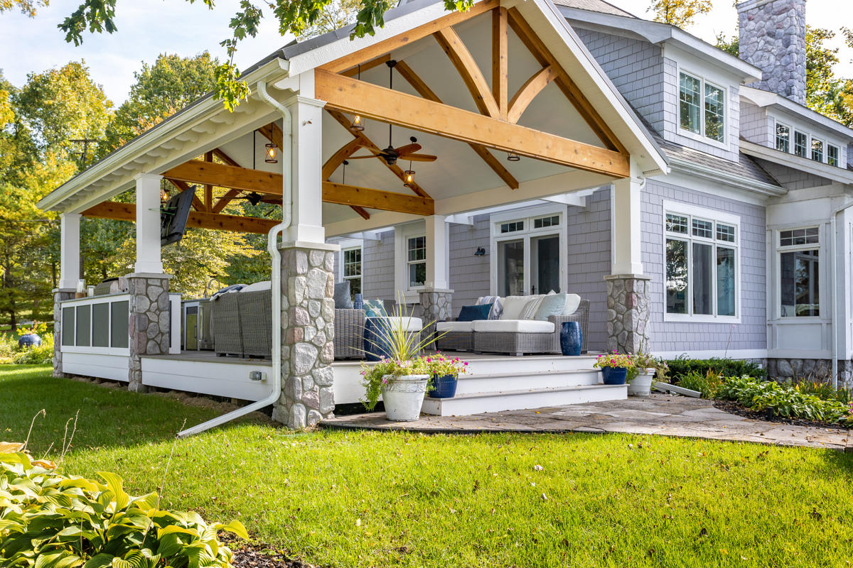 This outdoor haven features a fully equipped kitchen for entertaining, complemented by a spacious lounge area that invites relaxation, conversation, and all the enjoyment the lake offers. Shaded and thoughtfully positioned to capture the best views, this addition ensures usability in all the best MI seasons for timeless appeal.